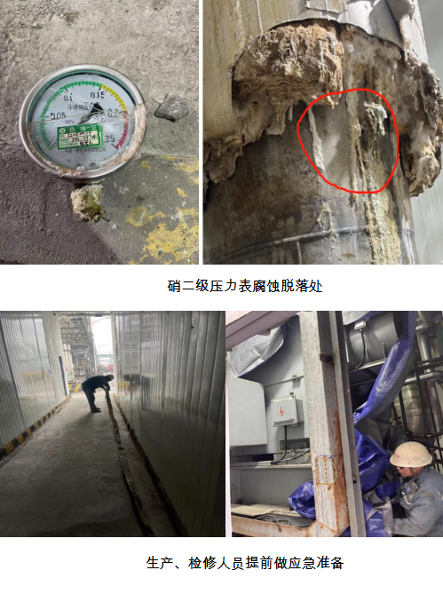34日9:23分蒸發(fā)濃縮硝二級強制循環(huán)蒸發(fā)器循環(huán)管道壓力表腐蝕脫落,硝二級高濃縮液存在泄漏風險,乙班白班班長林寧和電儀唐亮發(fā)現(xiàn)情況后立即匯報副部長楊平,楊平立即匯報生產部長黃安軍。若硝二級壓力表脫落,內部80方高濃縮液隨時會出現(xiàn)泄漏,導致重大環(huán)保事故和壓縮機電機有損壞風險。生產部隨即組織緊急停機、系統(tǒng)排空,消除潛在風險、隱患。