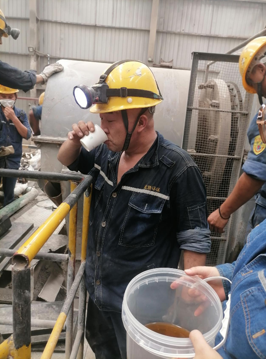 7月17日15時,西昌市氣溫已升至35 ℃。在生產(chǎn)區(qū)球磨機檢修平臺,機器轟鳴、焊花四濺。西昌藍鼎環(huán)保人力行政部李小方提著保溫桶,沿著滾燙的鋼梯來到作業(yè)點,為正在揮汗檢修的員工送上剛從冰柜取出的“定制涼茶”。