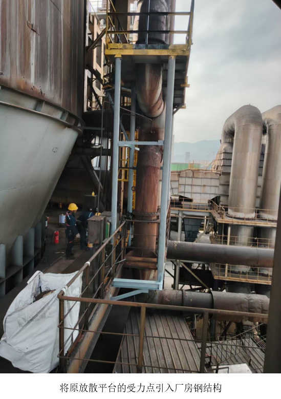此次改造重點聚焦優(yōu)化平臺受力結(jié)構(gòu)。原放散平臺受力點設(shè)于放散管道,結(jié)構(gòu)穩(wěn)定性欠佳,存在安全風(fēng)險。檢修班組經(jīng)科學(xué)論證與精心設(shè)計,將受力點轉(zhuǎn)移至廠房鋼結(jié)構(gòu)主體,大幅提升平臺承載能力,使整體結(jié)構(gòu)更為堅固可靠,徹底消除原設(shè)計隱患。